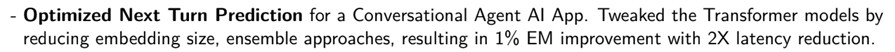 - Là thành viên của nhóm 2 nhà khoa học dữ liệu sở hữu kỹ thuật tính năng cho hệ thống phát hiện gian lận. Đã thêm 200 tính năng mới, giúp giảm tỷ lệ dương tính giả từ 20% xuống 15%, trong khi vẫn giữ nguyên tỷ lệ âm tính giả.